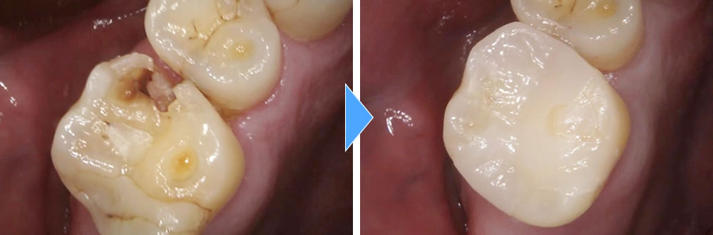 虫歯により穴が空いてしまっている歯の治療を行いました。まず虫歯を綺麗に除去した後、内面処理を行いました。虫歯になりにくい素材で強度の強い物で治したいというご希望でしたので、セラミックの詰め物を作成しました。結果、見た目も綺麗な仕上がりになりました。