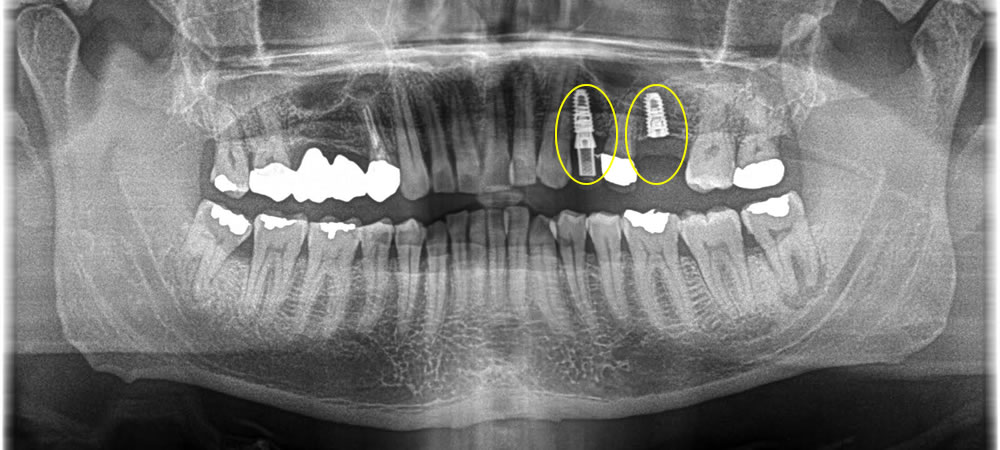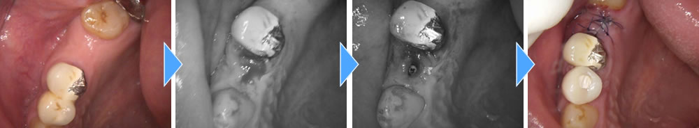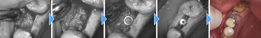 手前の歯は審美的に気になるという事でした。当該部分は骨がしっかりとあり、即時荷重が可能な状態なためインプラント埋入と同時に仮の歯を装着しました。また、手前の歯は6ミリ程度の切開で行ったため、縫合もなく痛み腫れもほぼ無く施術できました。