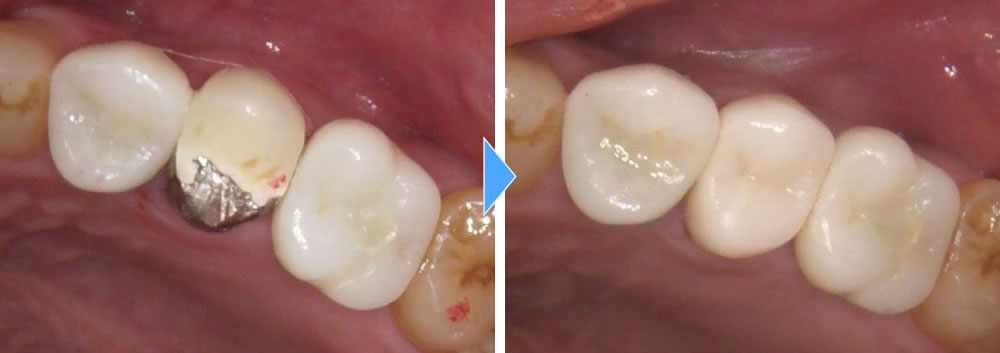 その後、3ヵ月待ちしっかりと骨と結合しているのを確認後、上部のジルコニアの歯を作成しました。最終的に残りの真ん中の歯も綺麗にしたいとの事で、セラミッククラウンにて治療を行いました。