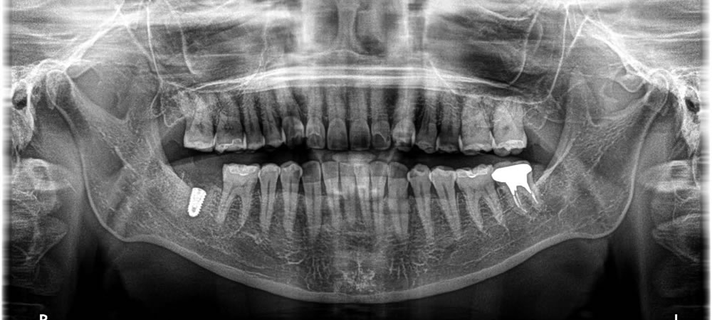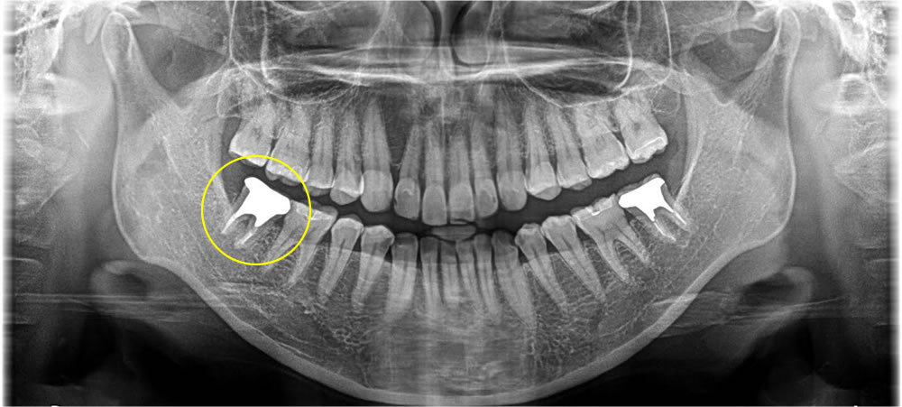 何もしていなくても歯が痛いという事で来院された患者さまです。CT写真を撮影し、診断したところ、分岐部病変、根尖嚢胞が確認できました。治療方針について患者さまと相談した結果、当該歯を抜歯してインプラント治療を希望されました。