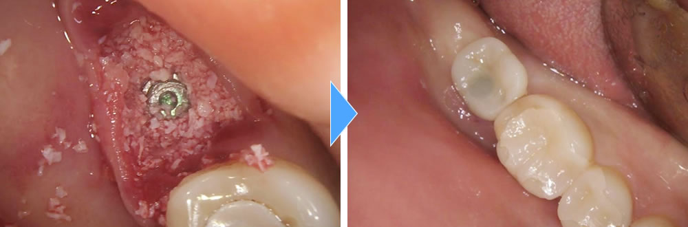 インプラント埋入時に骨造成(骨の再生を促す治療)を一緒に行いました。そこから4ヵ月待ち、上部にジルコニアの歯を装着して治療完了です。自身の歯と変わらない感覚でしっかり噛むことができるようになり、満足して頂くことができました。