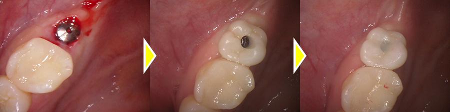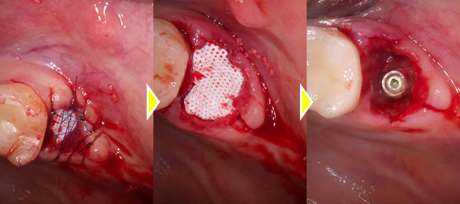 抜歯、膿や不良肉芽の掻把、骨造成、2回法でのインプラント体の埋入までを1回のオペで行い、その後定期的に経過観察をし、インプラントと骨が結合したことを確認できてから上部構造の型どり、セットまで行っています。