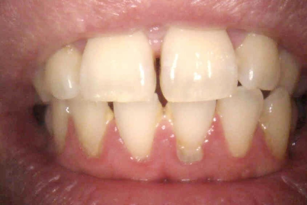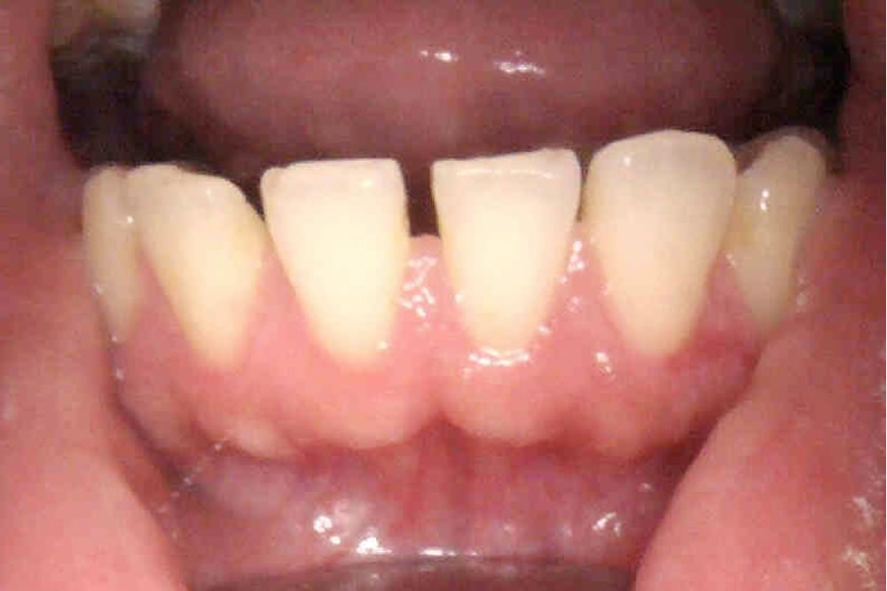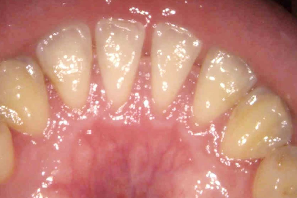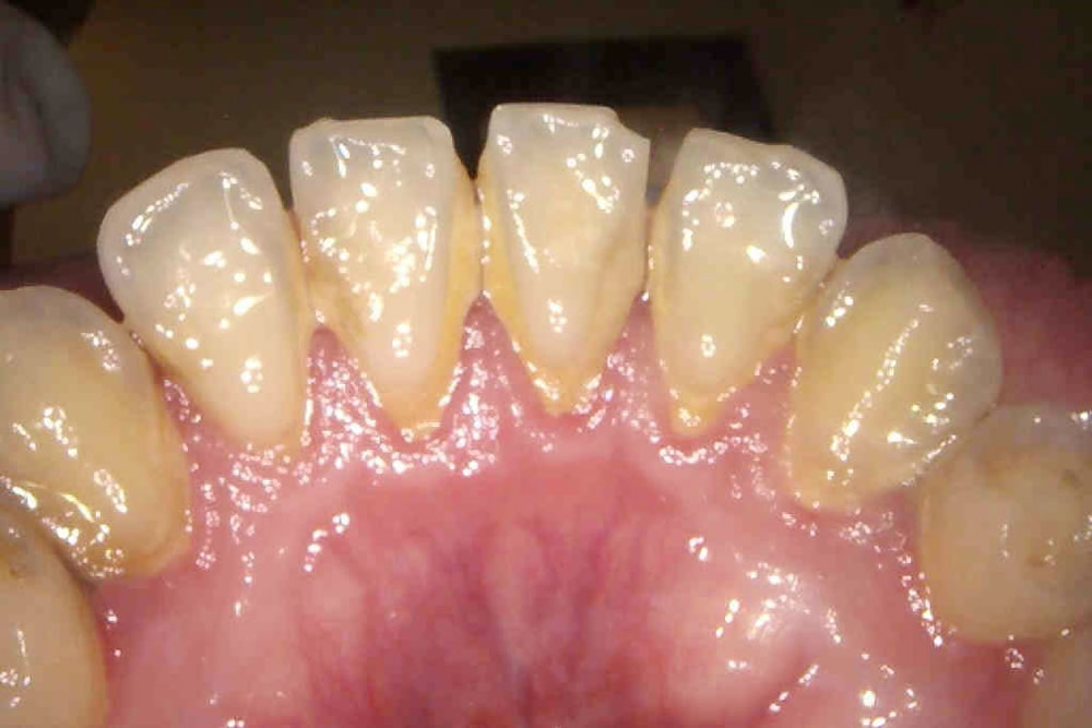 歯科医院を受診されたのは、5年ぶりとのことで、歯石がかなり分厚く沈着しており歯肉もかなり腫脹していました。まずは縁上の歯石除去、歯磨きの指導、さらに歯周病治療によって縁下歯石を除去しました。