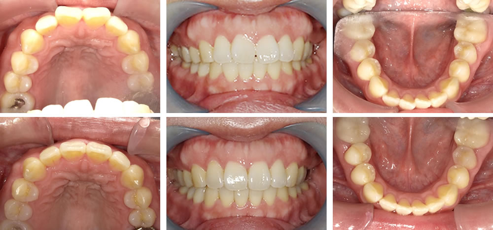 こちらの患者さまは前歯の傾きが気になるという事で矯正治療を希望されました。今回は前歯のみを動かす矯正治療にて、歯並びの改善を行いました。結果、短期間で並びを改善する事ができました。矯正後の保体装置としては、取り外しをする事ができるマウスピース型リテーナーを使用しました。