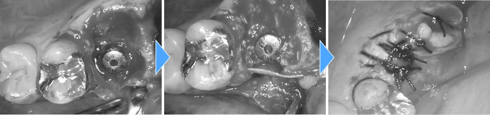 まず残っている歯の根を抜き、中の感染が起きてしまっている所をキレイに掻爬し、人工の根を入れて骨を作るところまでを1回の処置で行いました。