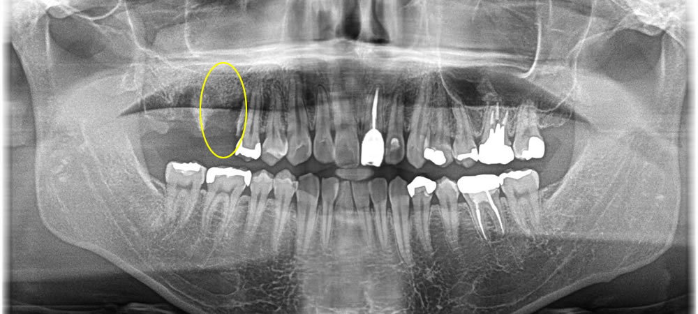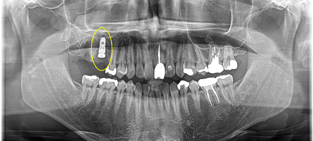 パノラマレントゲン写真にてチェックをしたところ、歯の根っこが割れて残っており、周りの骨も無くなってしまっている事が確認できました。治療方法を話し合った結果、残っている根を抜き手前の1本をインプラントでの治療をご希望されました。