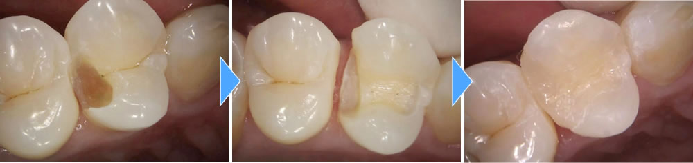 詰め物を作成するために形を整え、型取りを行いました。今回は2次的な虫歯にならないようにしたいという事で、セラミックの詰め物を選択されました。結果違和感も無く、綺麗な仕上がりになりました。