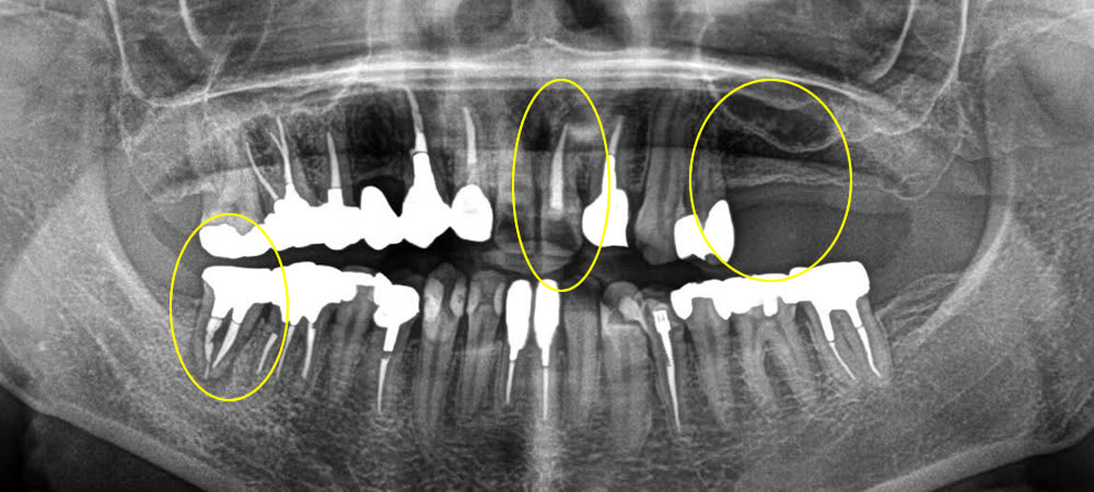 こちらの患者さまは、前歯がグラグラ揺れて痛い、右下奥歯が痛い、左側で噛む事ができるようになりたいとの主訴で来院されました。保存する事ができない歯にインプラント治療を行いたいというご希望でしたので、相談しながら治療計画を立案しました。