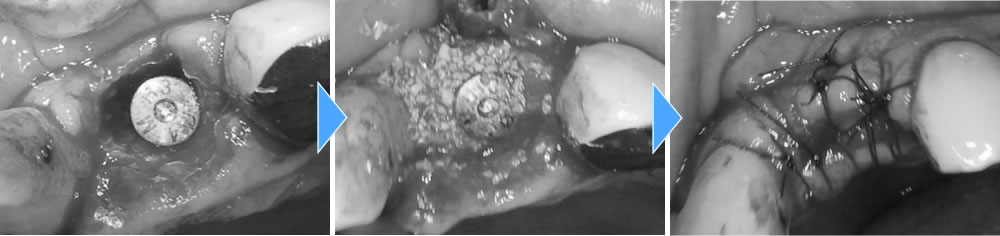 まず一番時間がかかる歯から治療を行ないました。保存不可能な右下奥歯を抜きインプラントを埋入し、骨がなくならないよう骨造成を行いました。次に前歯のインプラントを行いました。前歯は審美性もより考えて行うため、歯を抜きインプラントを埋入し、特殊な縫合を行い歯茎をしっかりと閉じていきました。最後に元々歯のないところにインプラントを埋入していきました。こちらは骨が元々ある場所なので、切開を最小限に抑え1本に対して6ミリ程度の切開幅でオペを行いました。それにより、術後の腫れ、痛みを最小限に抑える事ができました。
