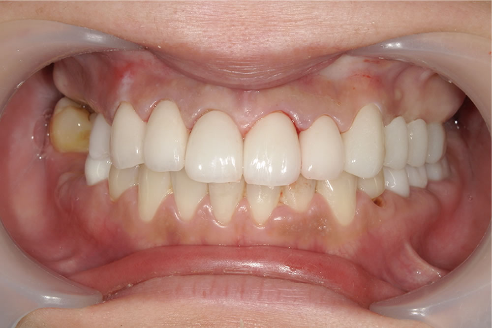 過去に他院で治療されたかぶせ物は歯肉の退縮により根が露出しているため、患者さまの希望により除去し、一回の治療で形成、仮歯に置き換え、後日歯肉の回復を待ってから型取りまで行いました。