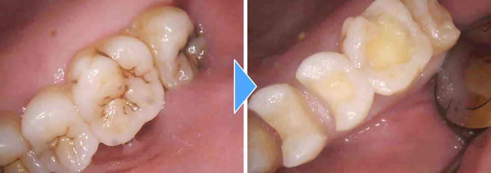 こちらの患者さまは、検診希望で来院されました。自覚症状はありませんでしたが、レントゲン写真と視診での検査の結果、左上の奥歯4本の歯と歯の間や咬合面に虫歯が確認できました。