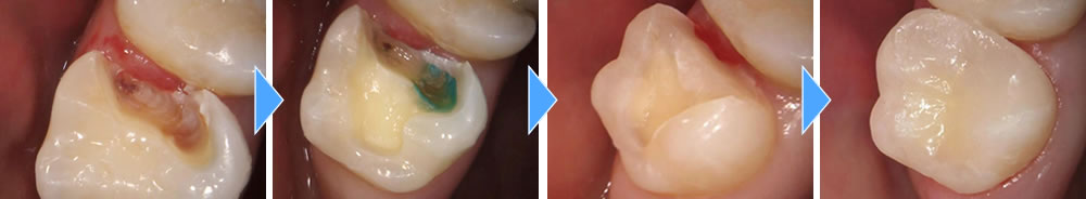 歯の間が虫歯になっていたため、検知液を使用しながら虫歯を丁寧に除去しました。虫歯が神経の近くまで進行していたため、神経を保護する処置を行った後、セラミックの詰め物を作成しました。自然な仕上がりになり、患者さまにも満足いただけました。