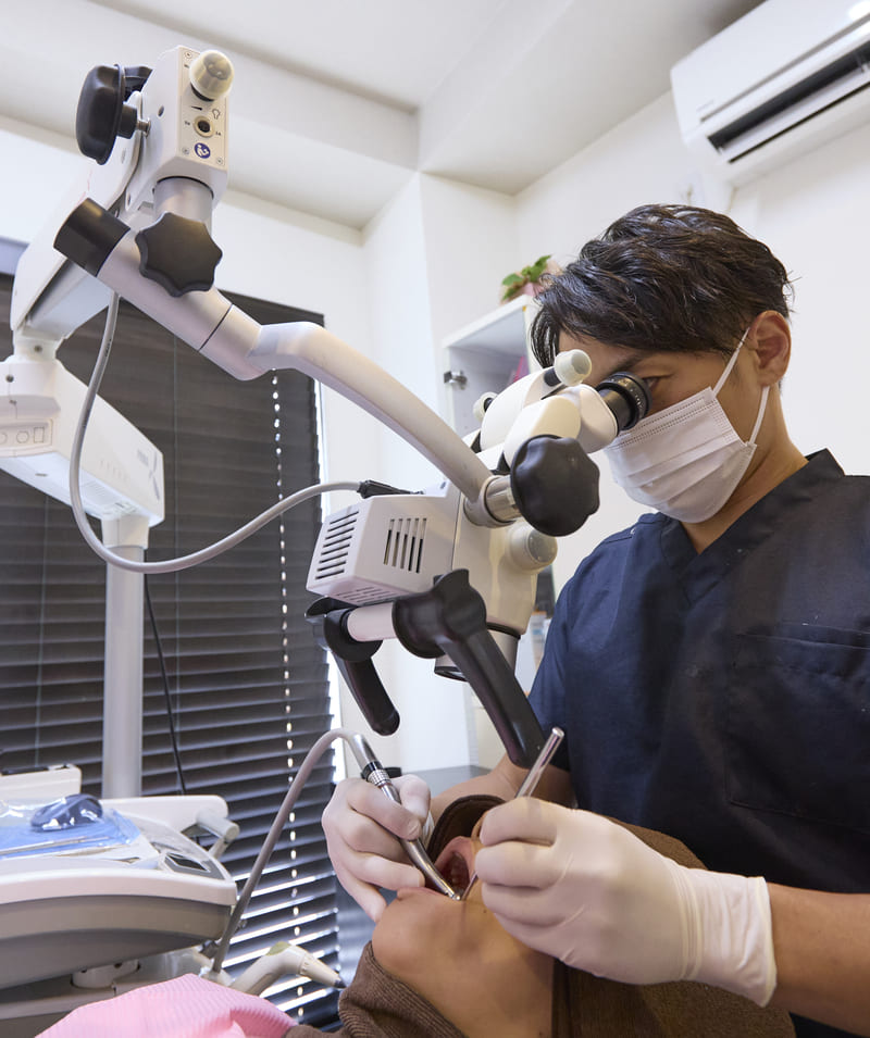マイクロスコープは治療部位を最大で20倍にまで拡大して観察できる、いわば「歯の治療に特化した高性能な手術用顕微鏡」です。 肉眼では到底確認することのできない、歯の根の内部の微細な構造や詰め物・被せ物と歯との間に存在するミクロン単位のわずかな隙間、あるいは歯の表面にできた微細な亀裂などを、明るい照明下で鮮明に映し出します。 これにより、診断の精度を高めるとともに、より精密で確実な治療を可能にします。