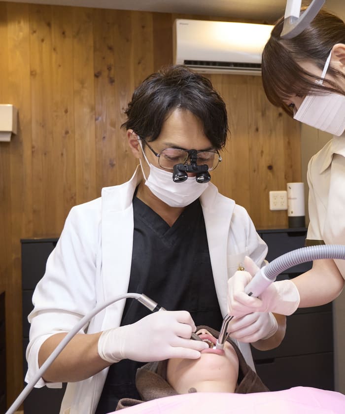 歯科医師や歯科衛生士が診療中に、常に眼鏡のように装着しているものが拡大鏡(ルーペ)です。 マイクロスコープが根管治療や歯周外科など、特定の極めて精密な治療において用いられる「据え置き型の高性能顕微鏡」であるのに対し、ルーペは日常的なあらゆる歯科処置の精度を底上げするための「携帯可能な拡大観察装置」と言えます。 虫歯の診断や治療、歯のクリーニング、歯石除去など、歯科医師・歯科衛生士が行うほぼすべての処置において、常に術野を数倍に拡大して行うことで、微細な虫歯の見逃しや歯石の取り残しなどを防ぎ、より質の高い丁寧な医療のご提供に繋がっています。